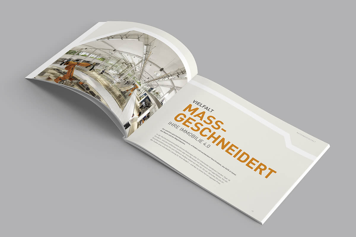 Das Ergebnis unserer Arbeit ist ein technisch-dynamischer Markenauftritt, der dem Charakter des geplanten Gebäudes gerecht wird. Die im A4-Querformat entwickelte Verkaufsbroschüre thematisiert die Innovationskraft des Standortes. Markante Elemente der Architektur wurden auf das Layout übertragen und verleihen den Inhalten eine kraftvolle Dynamik. Das großzügige Panoramaformat, die hochwertige Verarbeitung und das einzigartige Papier machen die Broschüre zum haptischen Erlebnis. Die mechanische Stanzung auf dem Titelblatt inszeniert authentisch das Logo und macht neugierig auf den Inhalt. Der in der Umschlaginnenseite eingesteckte Faltplan bietet einen großzügigen Überblick der Planung und kann jederzeit nach neuem Planungstand der Projektentwicklung aktualisiert werden.